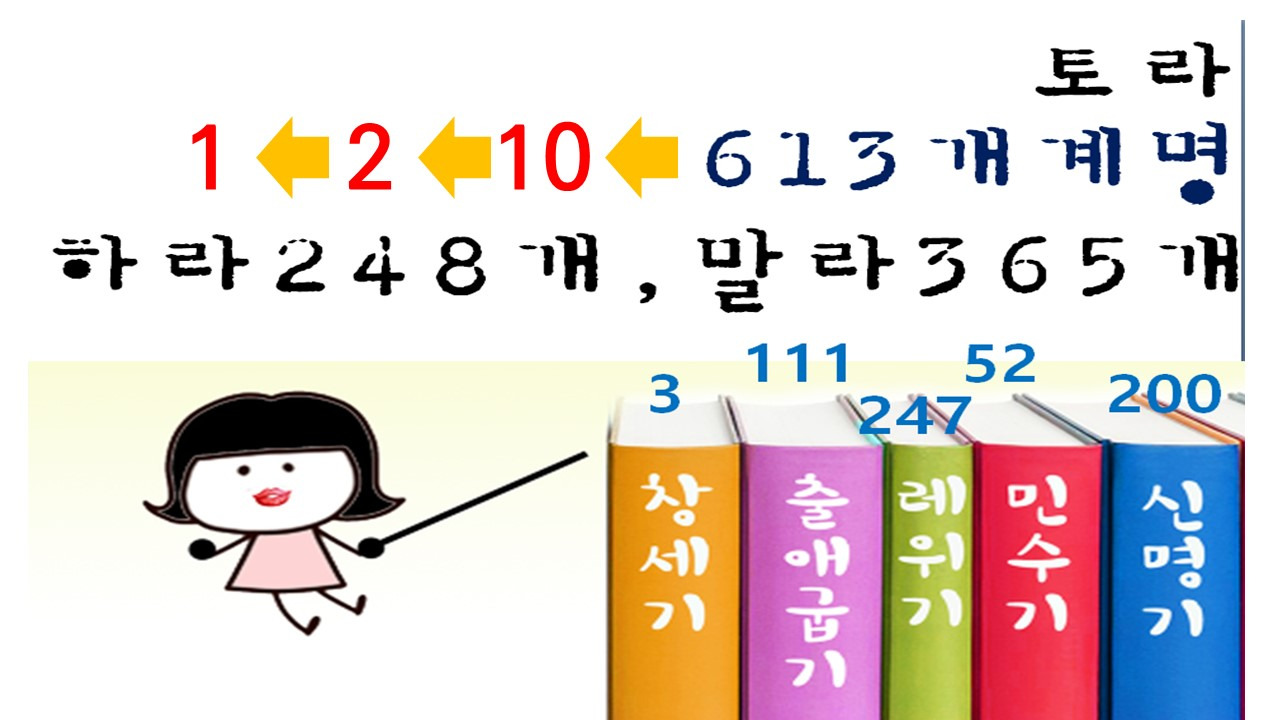 모세5경(토라)에는 613개 계명이 적혀있다. 하라는 명령은 248개, 하지 말라는 365개다.
