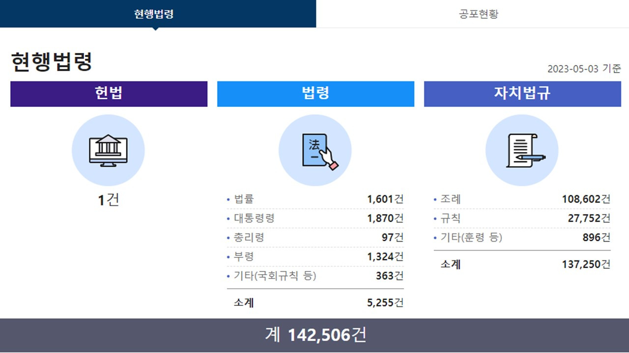 우리나라 법령은 5255건, 자치법규는 137,250건으로 모두 142,506건이나 된다.